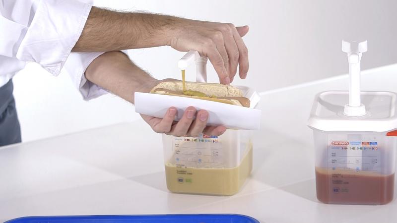 Dispenser per salse e sciroppi. Facile da riempire in modo che i condimenti possano essere trasferiti nella quantità richiesta per l'erogazione. Riduce i livelli di spreco pompando solo la quantità richiesta. Distributore verticale: maggiore comodità dell'utente, nessuna fuoriuscita accidentale. La valvola di chiusura mantiene chiuso il circuito di pompaggio, migliorando la conservazione del prodotto nel contenitore, anche in celle frigorifere