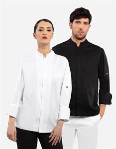Giacca da cuoco, in leggero tessuto di cotone, con rete di aerazione sulla schiena. Nuova allacciatura alla coreana, manica lunga con risvolto, chiusura con bottoni a pressione nascosti, taschino sul braccio sinistro. Capo molto confortevole grazie al tessuto leggero ed all'elasticità della rete posteriore, per il massimo confort nel lavoro in cucina. Prodotto 100% made in italy, Tomayouniform