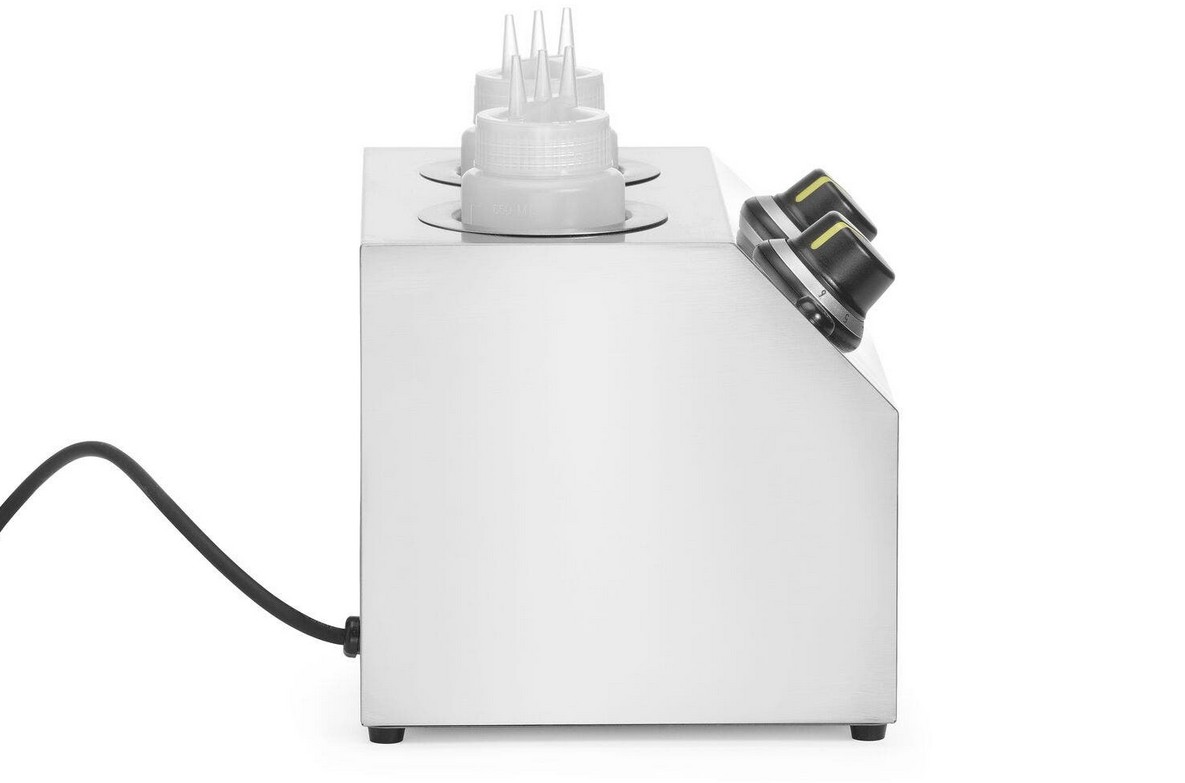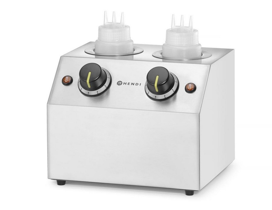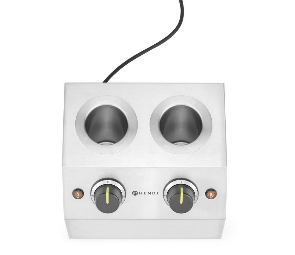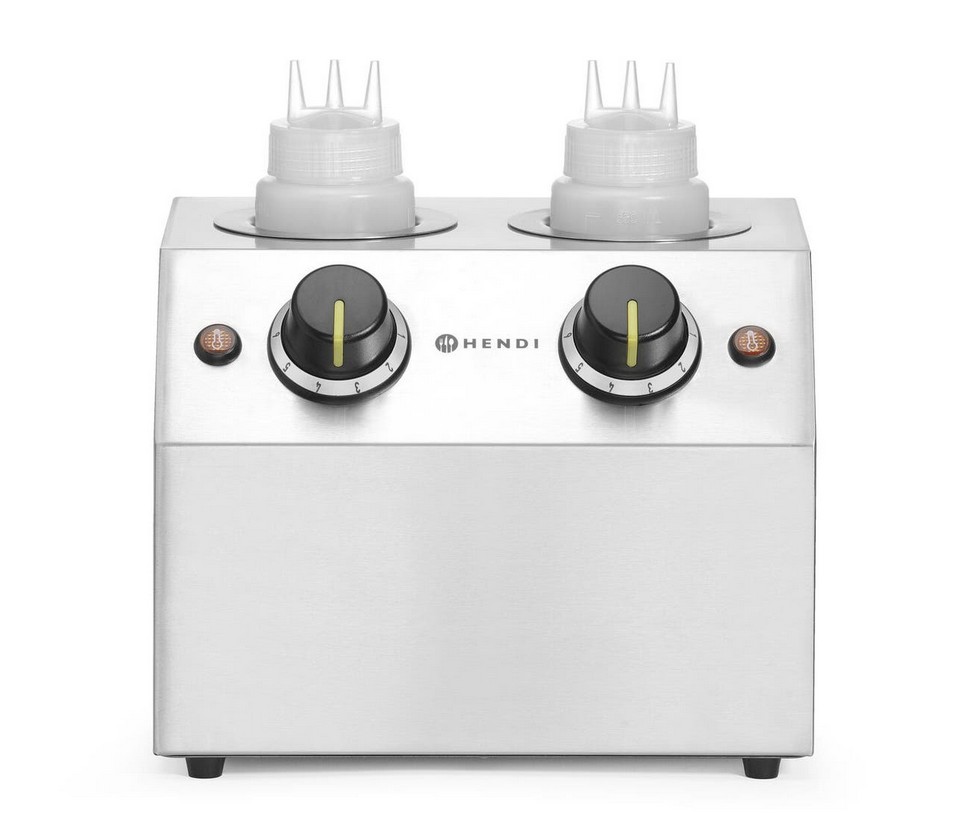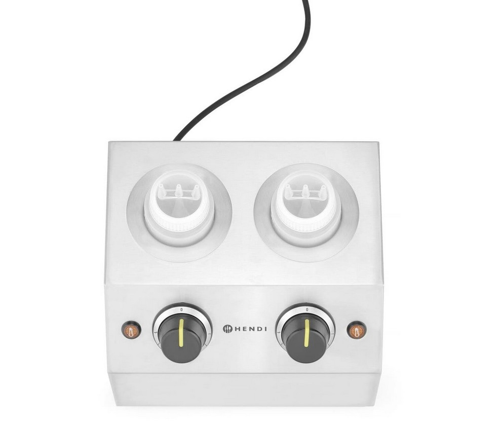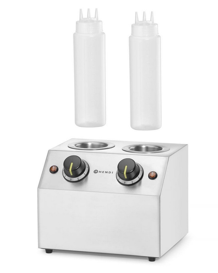 Scaldasalse HENDI in acciaio inox, ideale per mantenere cioccolato e salse alla temperatura perfetta. Regolabile su 6 livelli (30–65 °C), con spia di riscaldamento e protezione da surriscaldamento, include due flaconi dosatori da 650 ml per una versata uniforme e precisa