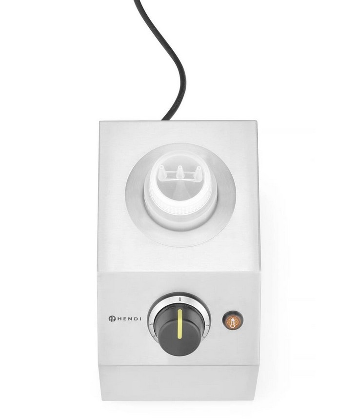 Scaldasalse professionale HENDI in acciaio inox, ideale per mantenere cioccolato e salse alla temperatura perfetta. Dotato di regolazione a 6 livelli (30–65 °C), spia di riscaldamento e protezione da surriscaldamento, include flacone da 650 ml per una versata precisa e uniforme.