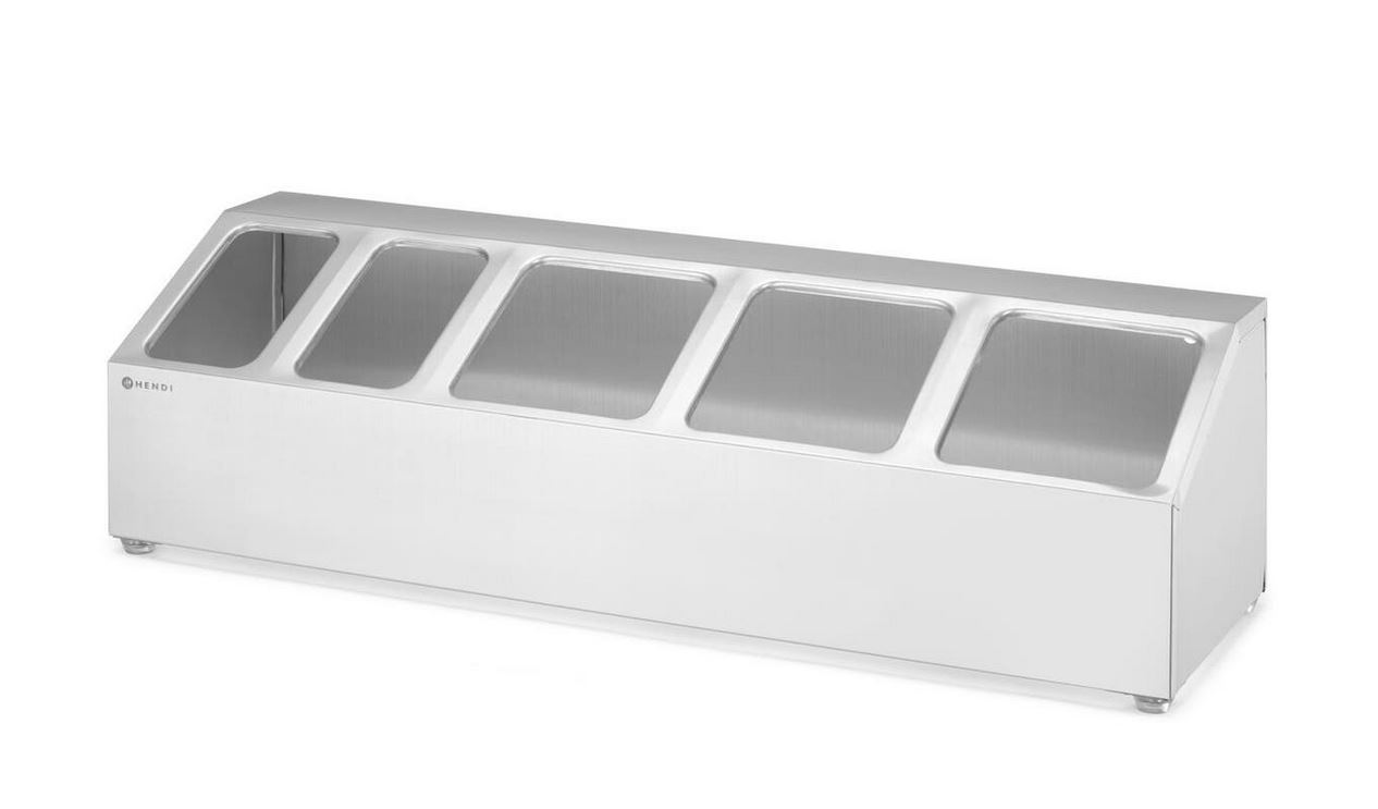 Il portacontenitore HENDI Gastronorm è una soluzione affidabile ed efficiente per l'organizzazione dei contenitori GN (non inclusi). Realizzato in acciaio inossidabile, offre stabilità con piedini in gomma antiscivolo e un montaggio a parete opzionale per un posizionamento flessibile. Dispone di 2 scomparti per gastronorm 1/9 e 3 scomparti per gastronorm da 1/6