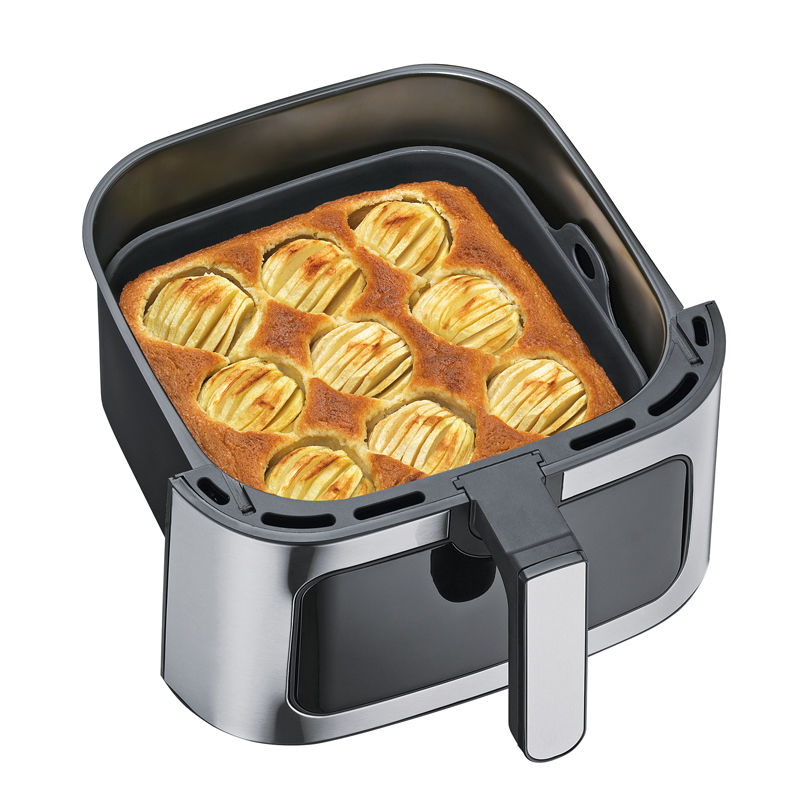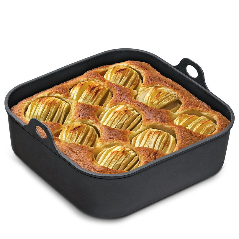Stampo in silicone per friggitrice ad aria, misura cm.24x24, altezza cm.9.5. Cottura perfetta, grazie alle eccellenti proprietà antiaderenti, garantisce una cottura uniforme e delicata. La speciale struttura del fondo favorisce la circolazione dell'aria e la distribuzione del calore , nonché il drenaggio dei liquidi in eccesso. Facile da rimuovere grazie alle maniglie laterali. Adatto a forno, microonde e congelatore. Prodotto Kuchenprofi