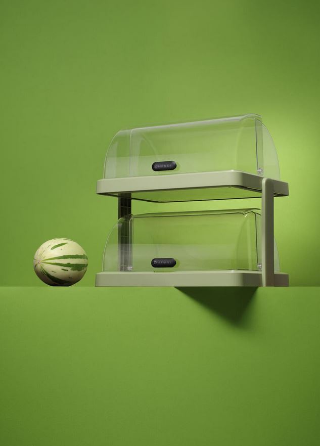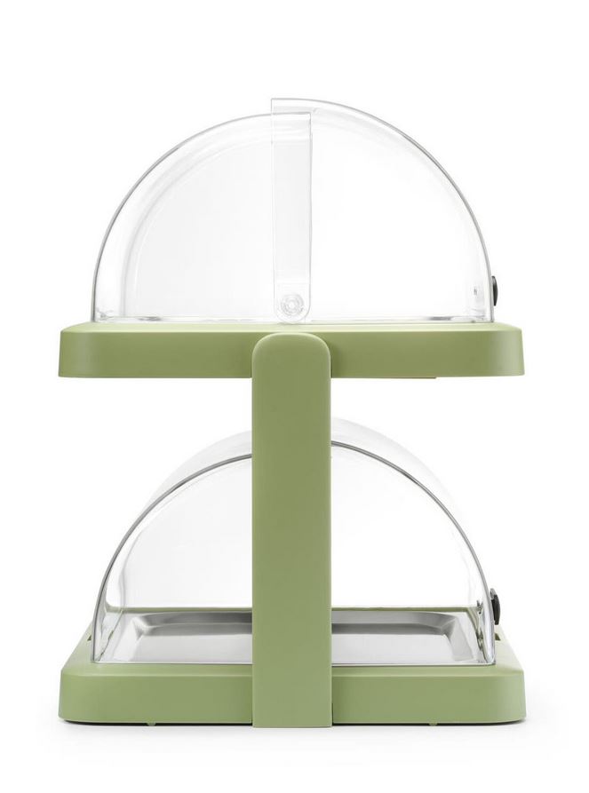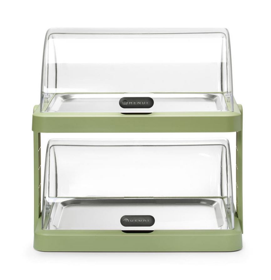 Unità doppia con 2 livelli per la presentazione del cibo a buffet. Incluso nel set: 2 basi. 2 coperchi roll-top con maniglie. 2 vassoi in acciaio inossidabile, ciascuno dei quali misura 400 x 300 mm. 4 elementi di raffreddamento. Telaio in plastica per 2 unità di visualizzazione.